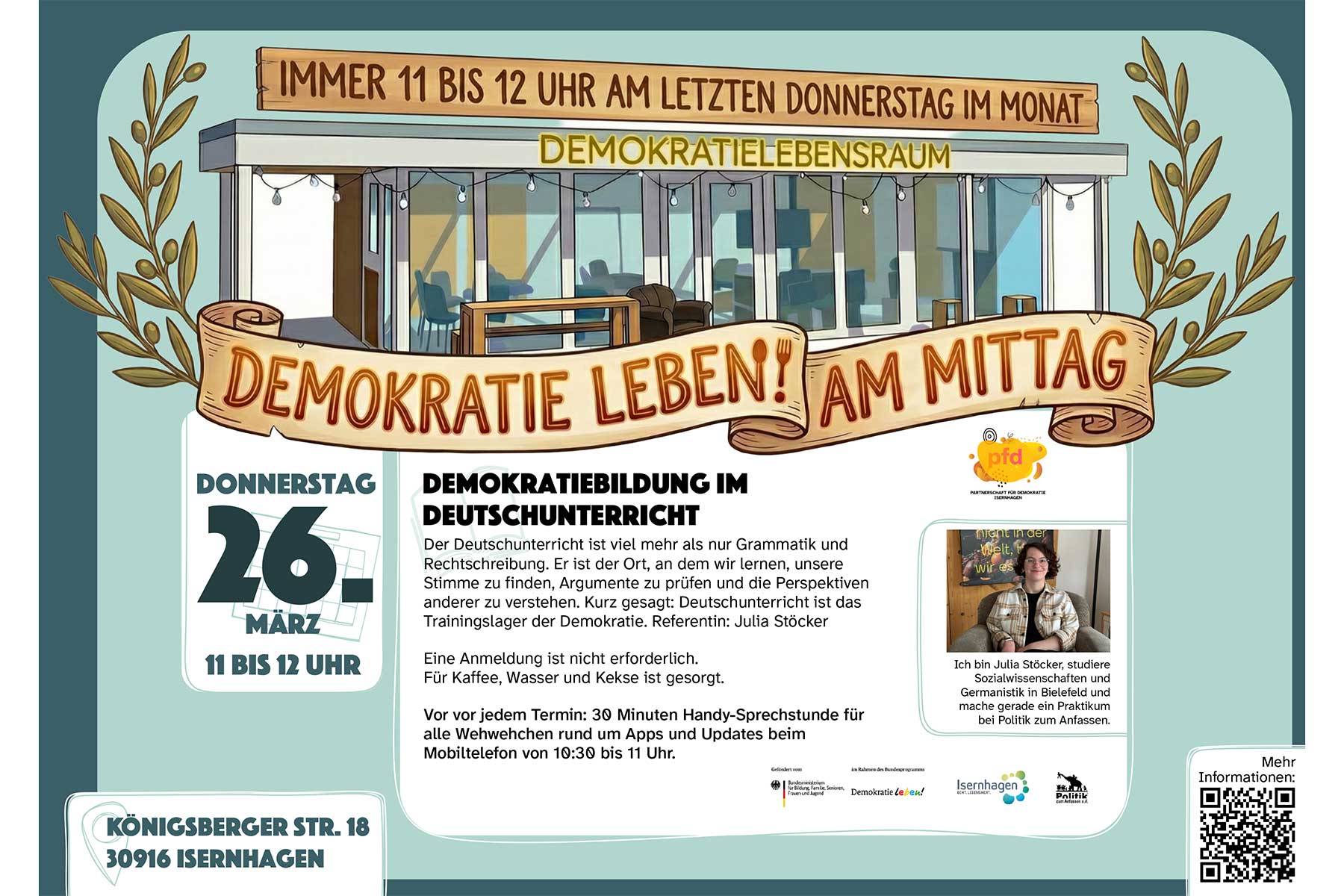 Im Demokratielebensraum in der Königsberger Straße 18 in Isernhagen findet am Donnerstag, 26. März 2026, von 11 bis 12 Uhr…